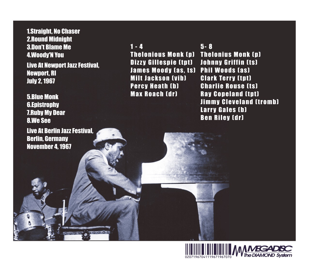 まずニューポートでのライブのメンバーは、アルト&テナー・サックスにジェームズ・ムーディ、ヴィブラフォンにミルト・ジャクソン、トランペットにガレスピー、ベースにはパーシー・ヒース、そしてドラムスにはマックス・ローチから成るセクステットでのライブ。オープニングは1966年にリリースされたモンクの代表作「ストレイト、ノー・チェイサー」でスタートしお次は「ラウンド&ミッドナイト」と続きこの2曲だけでも興奮は押さえ切れません。片やベルリンでのライブのメンバーはビッグバンドで構成されており錚々たる顔ぶれで、テナーにジョニー・グリフィン、アルトにフィル・ウッズ、トランプットにはクラーク・テリーというレギュラーのカルテットに5本の管を加えた編成で豪快なソロ・パートを披露しています。同年のパリ公演での欲求不満な演奏とは異なり、これが本当のモンク・ビッグバンドの迫力あるライブとなります。今週末は彼らが遺してくれた奇跡のような世界に浸りきってください。