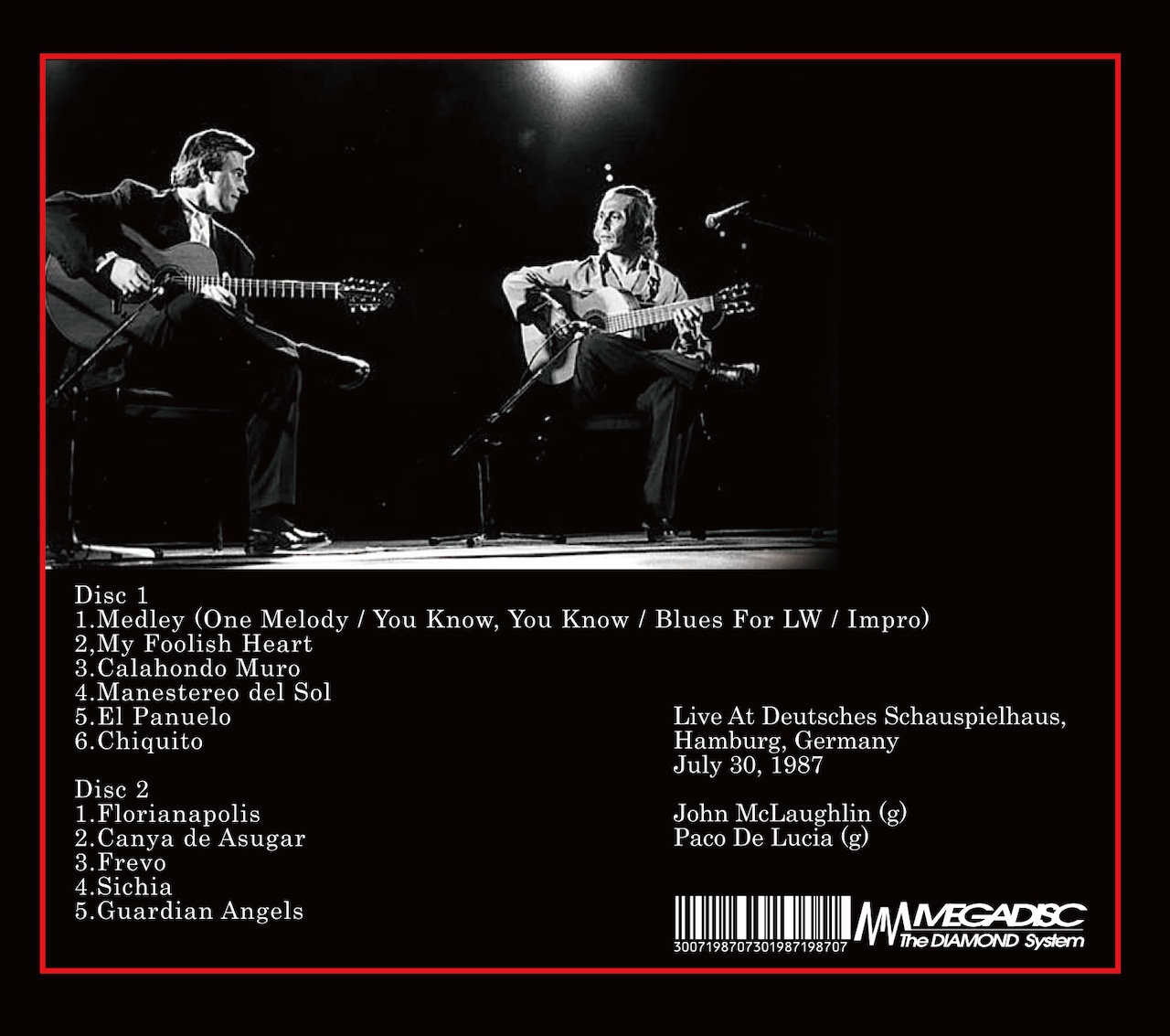 ジョン・マクラフリンとパコ・デ・ルシアの共演で世界的注目された1987年ヨーロッパ・ツアーより、7月30日のドイツ、ハンブルグ公演をマニア所有のサウンドボード音源でディスク2枚に収録したファン垂涎となるタイトルが登場しました。このヨーロッパ・ツアーからはメガ・ディスクより6月12日のドイツ、テュービンゲン公演と7月17日のベルリン公演が既にリリースされていますがライブ完全盤は今回のタイトルが初登場となります。ジョン・マクラフリンとパコ・デ・ルシアの二人によるアコースティック・ギターだけの共演となり卓越したギター・テクニックとそのパッションを存分に堪能出来るファン注目のライブをお楽しみ下さい。