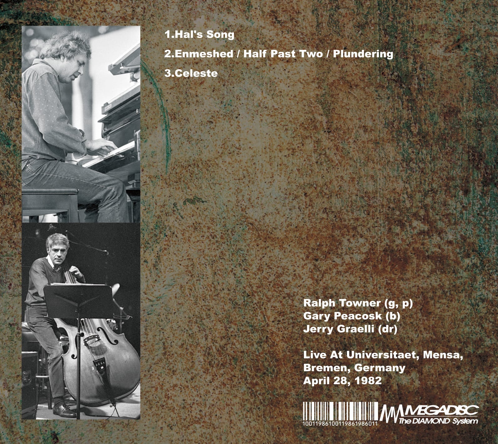 ECMを代表するギタリスト、またバンド「オレゴン」の活動でも有名なラルフ・タウナーが、ベースにゲイリー・ピーコック、ドラムスにジェリー・グラネリとで構成されたトリオで行わった1982年のヨーロッパ・ツアーから4月28日にブレーメン大学でのライブを、昨年再放送された極上音源より最高のクオリティーで収録したECMファン感激のアイテムがリリースされました。タウナー独自の美しいアコーステック・ギターの響きとゲイリー・ピーコックの鋭いベースとで奏でられる透明感あるアンサンブルはスタジオ盤では味わえないサウンドが体感して頂けます。また、セットリストにおいても中盤に40分にも及ぶメドレーにおいては、三人の息の合ったインプロゼーションが聴きモノとなっております。最初から最後まで心地よく異空間のライブを一点の曇りも無い音質でお聴き頂けます。