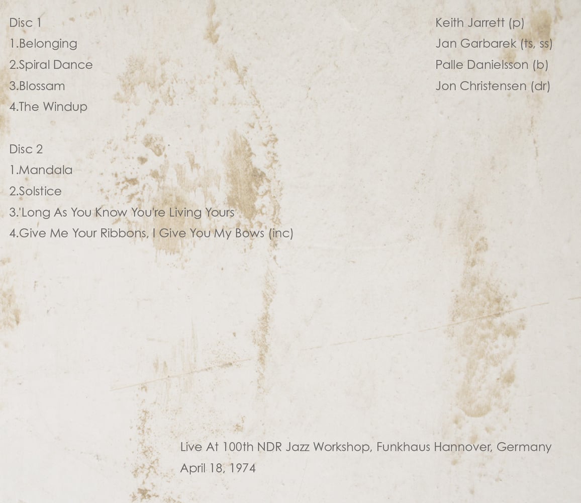 この時期のカルテットは、ECM的リリシズムとフリー・ジャズ的緊張感が最も高次で融合した段階にあり、長大なインプロヴィゼーションの中でテーマ、リズム、音色が有機的に変容していくプロセスが鮮明に捉えられている。ガルバレクの鋭利で空間的なフレーズ、ダニエルソンの歌心あるベースライン、クリステンセンの流動的かつ色彩的なドラミングが、ジャレットの奔放でスピリチュアルなピアノと拮抗しつつも深く呼応してます。