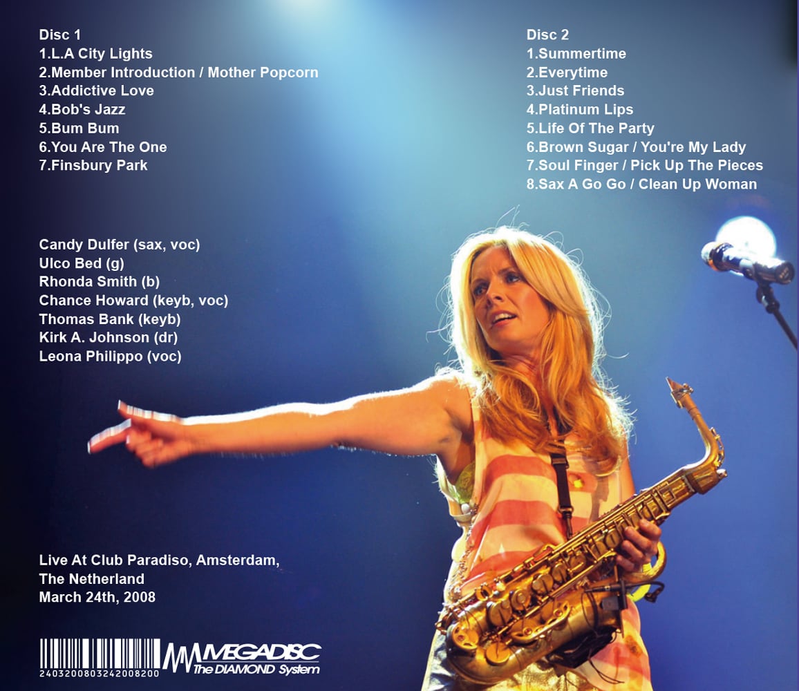 Funk、Smooth Jazz界のトップサックス奏者に君臨してるキャンディ・ダルファーが地元アムステルダムの名門クラブ「パラディソ「に登場した2008年ライブを過去の音源を一掃するステレオ・サウンドボード音源で記録した決定盤が登場しました。