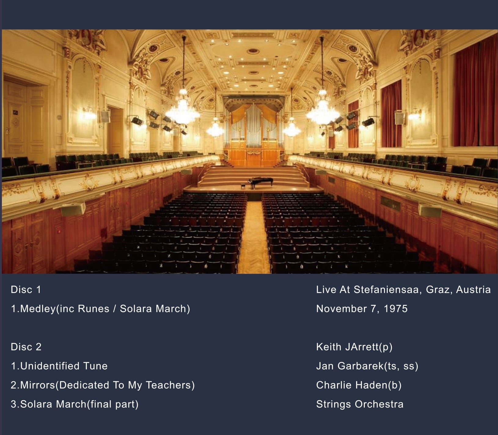 今回、登場したオーストリア・グラーツ公演はアルバムと同じメンバー、構成で行われた非常にレアーなライブ。キースのロマンチックなピアノにヤン・ガルバレク、チャーリー・ヘンデンの鋭いジャズ・スピリッツを優しく包み込むような美しいストリングスの響きがドラマチックな世界を表現した最高のステージです。それは音楽というより、響きの風景。触れれば消えてしまいそうな、1975年の夜の記憶であります。