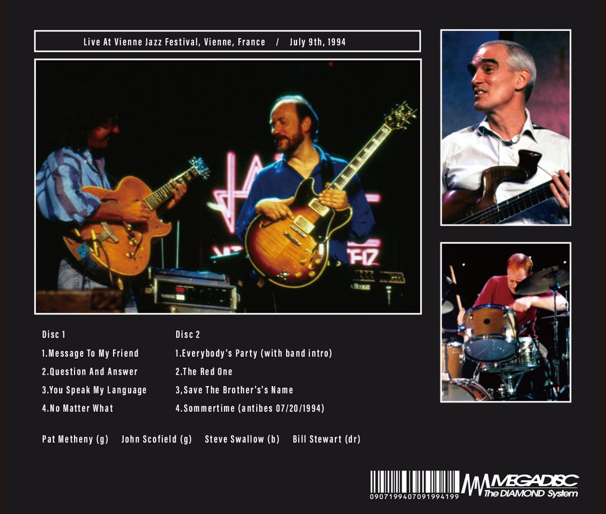 特筆すべきは、テーマ部でのユニゾンの美しさから一転、ソロに入った瞬間に炸裂する緊張感。スコフィールドのブルージーで歪んだフレーズに、メセニーが透明感あふれるコードワークで応酬する構図は、このデュオならではの醍醐味です。さらにリズム隊の強力なグルーヴがそれを下支えし、ライヴならではの推進力を生み出しています。本音源はその“黄金期の実録”として非常に価値の高い音源です。尚、ディスク2「Save The Brothers's Name」に僅かながらノイズが出ますがこれはマスター音源に由来してます。
