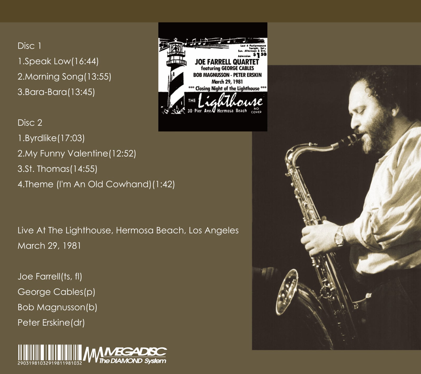 1960年代にはサド・ジョーンズ&メル・ルイス・オーケストラに参加し、チャーリー・ミンガスやエルビン・ジョーンズのカルテットにも参加、そして伝説と云われるリターン・トゥ・フォエバーのデビュー・アルバムにも参加してその実力はジャズ・ファンに強い印象を残しています。1970年中盤からは、CTIレーベルに移籍しアルバムを3枚録音しその中の「ペニー・アーケイド」は今聴いても新鮮で後のジャズ・シーンに大きな影響を与えたアルバムです。さて、CTIレーベルを離れ新たにコンテンポラリー・レーベルに移りフレディ・ハバード、ピーター・アースキン等が参加したアルバム「ソニック・テキスト」をリリースしスリリングなプレイで彼の傑作として評価の高い作品をリリースしました。本ライブは、そのアルバムをリリースしたのツアーからロサンジェルスにある名門ジャズ・クラブ「ザ・ライトハウス」で行われたライブで、一説にはこのライブはオフィシャル録音されながら何故か未発表に終わった幻の音源と言われたライブ音源です。メガ・ディスク・レーベルでは、限りなくマスターに近いステレオ音源を元ソースに本ライブをCD化しており原音の持つ魅力を最大限に引き出しています。歴史的な名音源をお楽しみ下さい。