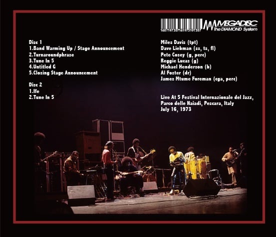 1973年、夏のヨーロッパ・ツアーから7月16日にイタリアで開催されたペスカーラ・ジャズ祭に出演したライブを10年前に新たに発掘された音源「ソースB」を24ビット・リマスター制作されたマニア必聴盤。マイルス・マニアから絶対の信頼を得ているデフィニティブ・シリースよりリリースされた本盤では、そのソースB音源をマイルスのデフィニティブ・シリーズの音源を提供して頂いてる海外マイルス・マニア(コードネーム:plaz)がプロ用スタジオ・レコーディングソフト「Pro Tools」を使い現状としてベストな音質にレストア収録しています。驚くことはこの音源が今から約半世紀前に録音されたオーディエンス音源と言うことです。元テープの経年劣化は多少ありますが、広がりある臨場感は鳥肌モノです。一説にはソニー初のコンパクト・カセットレコーダーであるTC-110Aで録音されたと伝えられています。リール・マスターでは無いことにも驚かされます。当日のファースト・セットをディスク1に、そしてセカンド・セットをディスク2に合計109分以上演奏されたフルショーの模様を時空を超え体験して頂けます。