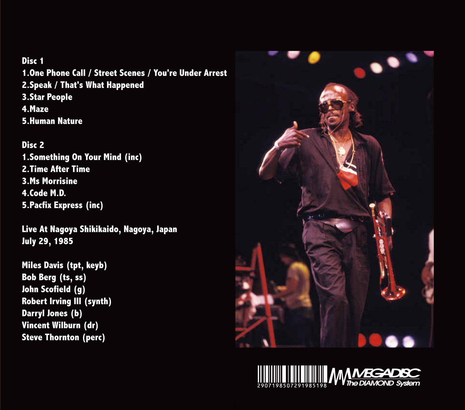 1985年、夏の来日公演から7月29日に名古屋市公会堂で行われたライブの模様を経年劣化を感じさせないマスター音源より初めてCD化され登場したマイルス・マニア垂涎となるアイテムです。マイルスの膨大なライブ・アーカイブスより過去、未CD化だった1985年7月29日の名古屋市公会堂でのパフォーマンスがこの度メガディスクより遂にクリアーなオーディエンス音源で登場しました。マニアから名演と言われている7月28日の東京公演翌日のライブとなりその好調ぶりはここ名古屋でも健在です。