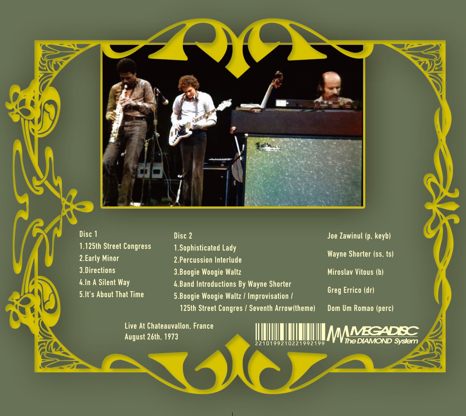 突然再放送された1973年8月26日のフランス、シャトーヴァロン公演のライブをオフィシャル級となる極上クオリティーで収録したファン衝撃となる決定盤が誕生しました。名作アルバム「スウィートナイター」のリリースに伴うヨーロッパ・ツアーからのライブとなり、このシャトーヴァロンでのライブは20数年前にメガディスクからリリースされていました。今回の再放送ははじめて当日のライブを演奏された曲順通り放送し、しかも全く劣化が無いオリジナル・マスターを使用した放送と言うことで聴いた瞬間「オフィシャルか?!」と勘違いしてしてしまいます。ザヴィヌル、ショーターは電化したマイルスの方法論に共鳴しそれを更に高めたパフォーマンスを展開したライブとなり、スタジオでは決して再現出来ない凄まじいインター・プレイの応酬は必聴です。ジャズ、ロックのジャンルを超越したエナジーが爆発した驚愕の演奏をご堪能頂けるタイトルとなります。ドラムのグレッグ・エリコはスライ&ファミリー・ストーンの創設メンバーでオリジナル・ドラマーとなります。