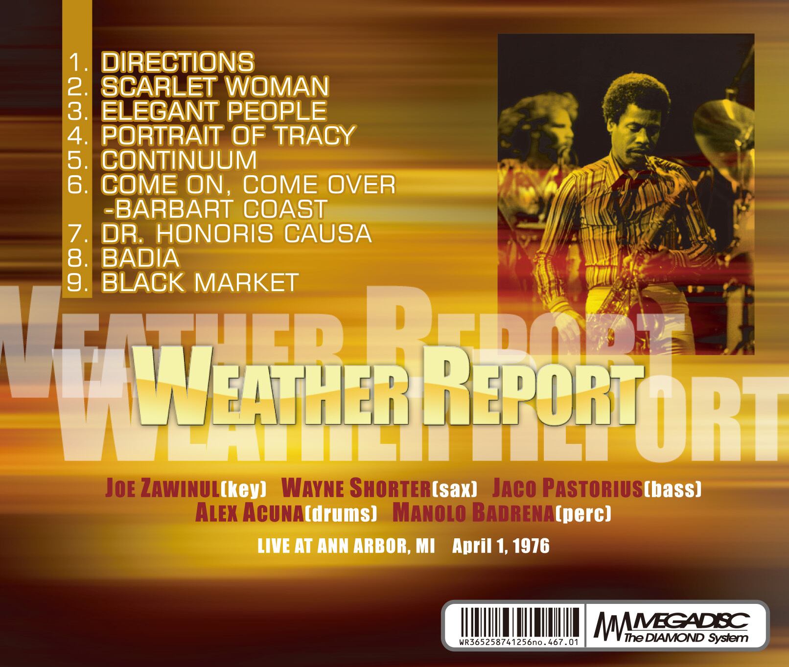 ジャコ・パストリアスのバンド正式加入デビューとなったファン垂涎のライブ。1976年4月1日、ミシガン州、アン・アーバーで開催されているアン・アーバー・ジャズ・フェスティバルでのライブをサウンドボード収録。ここからジャコ伝説が始まったと言っても決して過言ではありません。ジャコ在籍時では殆ど演奏されていない「ディレクション」からスタート。ザヴィヌル作の名曲でマイルスのバージョンでも有名な楽曲です。更に本ライブで驚かされることは、「ジャコ・パストリアスの肖像」に収録されている「カム・オン、カム・オーヴァー」が披露されている点です。そのままアルバム「ブラック・マーケット」に収録されている「バーバリー・コースト」へと演奏は続き会場のボルテージは最高潮。彗星の如く現れた無名に等しい新人だったジャコがジャズ界を震撼させた一夜ともなった記念すべきライブ!!