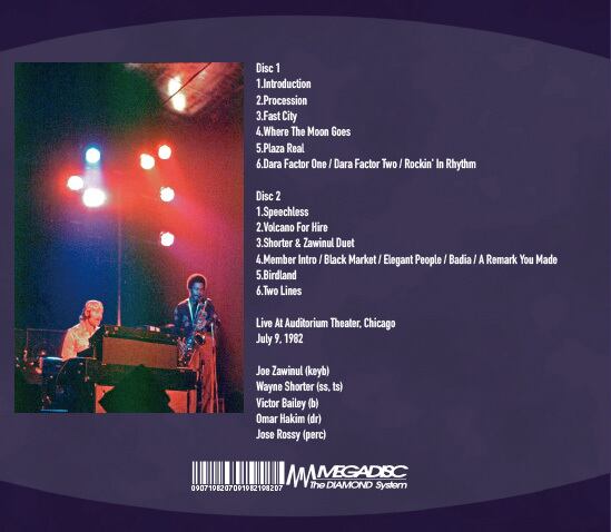 アルバム「ウェザー・リポート'81」を最後にジャコ・パストリアスとピーター・アースキンが脱退の脱退し、2年後の1983年にオマ・ハキム、ヴィクター・ベイリーが参加し第4期ウェザー・リポートとして制作されたアルバム「プロセッション」までの空白期間に行われた全米ツアーから7月のシカゴ、オーディトリアム・シアター公演を経年劣化を感じさせない驚愕のオーディエンス・マスター音源をデジタル・トランスファーしたタイトルとなります。1982年のツアーからはメガー・ディスクよりスターライト・ボウル公演がリリースされていますが、今回新たに発掘されたシカゴ公演ではオマ・ハキムが叩き出す驚異のテクニックと若きヴィクター・ベイリーのスタジオでは味わえないファンキーなベースとがフロントのショーター、ザヴィヌルをしっかり支え全く古さを感じさせないグルーブを出しています。この衝撃的なパフォーマンスを聴くと改めてこの時期を再評価する声も上がると思われます。しかし、ショーターとザヴィヌルのビシッと揺るがない安定感は絶大です。手応えたっぷりの中音域も高密度な重低音もしかっかりと聴き分けることが出来る音質は正に絶品です。1983年のケルン公演を凌駕し第4期ウェザーのベスト・パフォーマンスと言っても決して過言ではない最高のライブをご体感下さい。