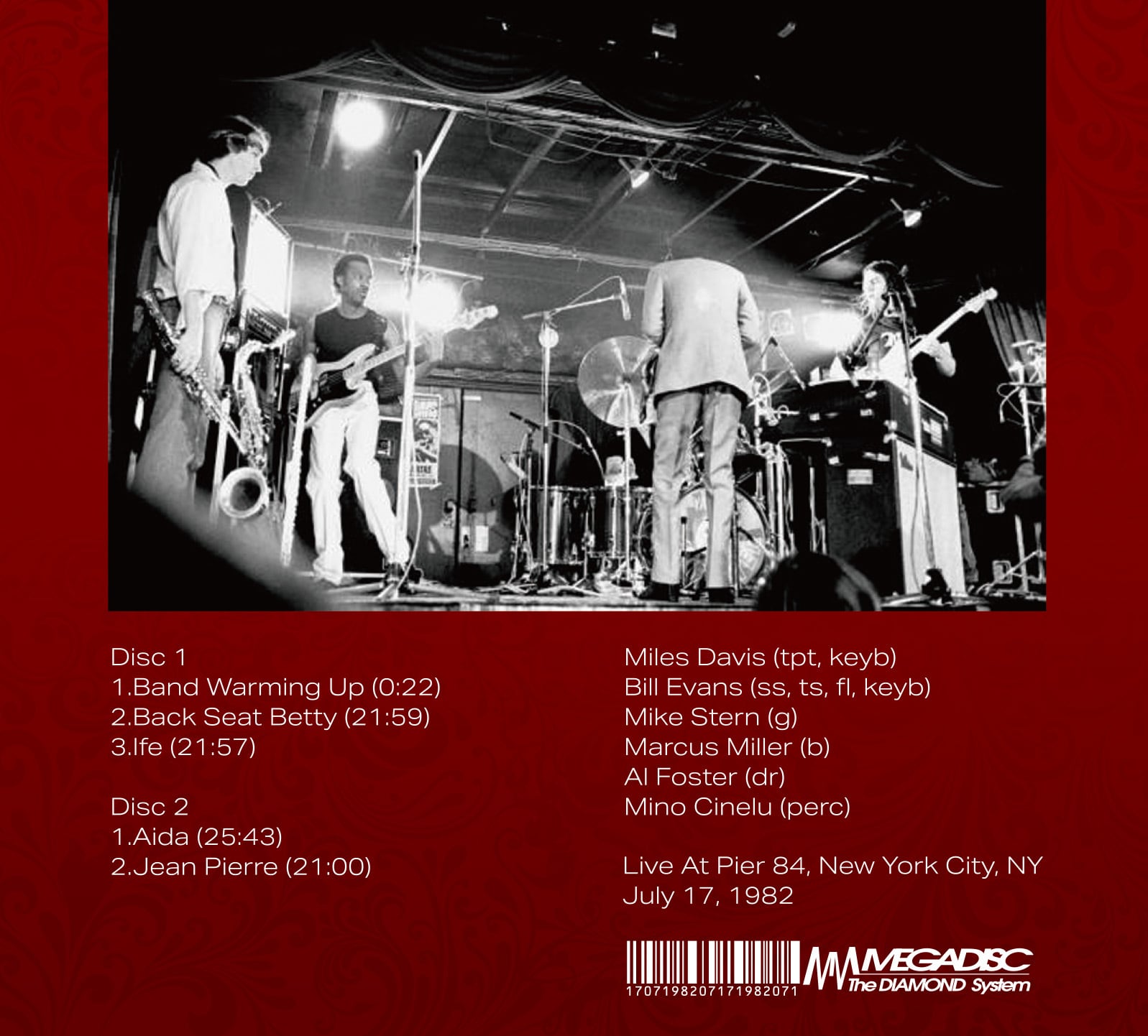 1982年、4月1日にボストンのブランフォード・ホテルでのウォーミングアップ・ライブ(メガディスクから既発)の後からスタートしたワールド・ツアーは4月、5月とヨーロッパ各地を周り7月にアメリカに上陸しました。今回リリースされたニューヨーク、ハドソン川沿いの第84埠頭(通称:ピア 84)公演は、ヨーロッパ公演の大成功が伝わり大いに注目された中で行われました。マイルス音源コレクターで有名なピーター・ルーシンさん(Peter Losin)のサイト(MilesA head)に記載されているデータを参考にすると本公演はラストのジャン・ピエールが途中で切れているBランクのオーディエンス録音が紹介されておりその備考欄に「ヤン・ローマン氏によればジャン・ピエールが21分の完全版もある」と記載されています。そうです、本音源こそヤン・ローマン氏が所有していたサウンドボード音源の完全版となります。但、ディスク2の1曲目「アイーダ」において37秒の欠落部がありそこを未発表のオーディエンス音源を補填することで全長版を実現しました。勿論、プロによる作業となりアジャスト作業に抜かりはありません。1982年、全米ツアーの最上位に位置するベスト・パフォーマンスを初めてお聴き頂けます。