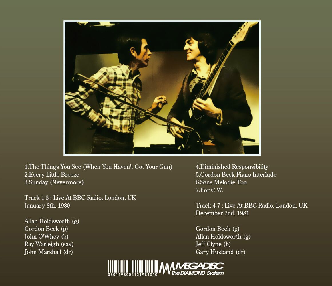 盟友とも言えるゴードン・ベックが参加した貴重なライブをイギリス国営放送BBCが放送した1980年、1981年の音源を収録したファン垂涎となるライブ・パフォーマンスが登場しました。1980年のライブは「JAZZ IN BRITAIN」という番組で放送されたライブとなりメンバーにはゴードン・ベックの他、ソフトマシン時代からの友人であるジョン・マーシャル、そしてサックスにはこちらもホールズワースと付き合いもあり多数のセッションにも参加してるレイ・ウォーレイが加わっています。後半には1981年のゴードン・ベック・トリオにアラン・ホールズワースが加わったカルテットでのライブとなります。ゴードン・ベックは、アラン・ホールズワースが1979年から1988年の間に少なくとも5回レコーディングしたピアニストで、そのうちの2枚のアルバム、1980年の「ザ・シングス・ユー・シー」と1988年の「ウィズ・ア・ハート・イン・マイ・ソング」は共同リーダーだでした。再放送がありませんので本タイトルがリリースされた意味はファンにとって意義あるリリースといえます。