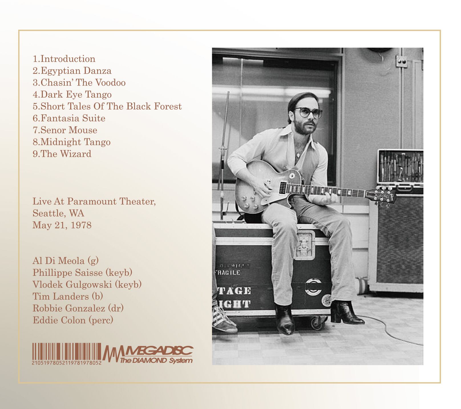 ソロ3作目となるアルバム「カジノ」のリリースに伴う全米ツアーからキーボードに日本人アーチストとの共演が多く人気の高いフィリップ・セスが参加したシアトル、パラマウント・シアター公演を全米でFM放送されたライブ音源を初収録したピカイチとなる発掘音源が登場しました。ディメオラの魅了を最大限に表現したアルバム「カジノ」とはバック・メンバーが異なりセスとウロデック・グルゴウスキーのキーボード2台、ベースにはトム・スコットやギル・エヴァンス、またタイガー大越のアルバムにも参加しているティム・ランダーズ、そしてドラムには国内アーチストとの共演も多いロビー・ゴンザレス、パーカッションにはアルバム「カジノ」に参加していたエディ・コロンとなりディメオラをサポートしています。また、発掘されたテープ自体の保存状態も大変良く劣化が感じられないことも重なりこのような素晴らしい音質でお聴き頂けます。アル・ディメオラのライブ決定版をたっぷりとご堪能下さい。