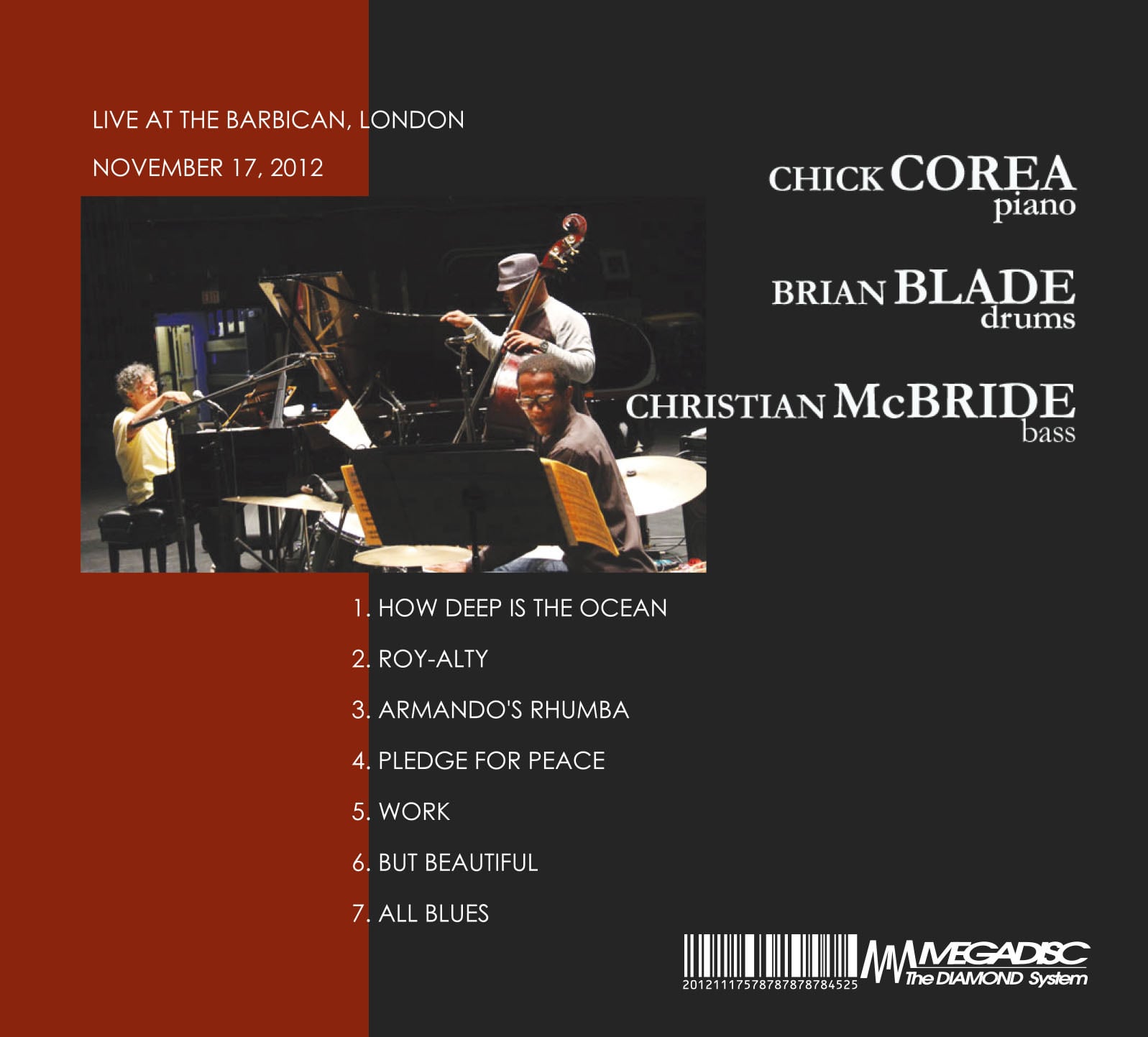 2012年11月17日、ロンドンの有名ホール「ザ・バービカン・センター」に出演したチック・コリア・トリオのライブをイギリス国営放送BBCでオンエアーされたライブをオフィシャル級の音質で収録した美的感覚に溢れる美しいライブCDです。ドラムには国内でもファンが多いことで知られるブライアン・ブレイド、そしてベースにはジョシュア・レッドマン、パット・メセニーらのバンドに参加して確固たる地位を築いたクリスチャン・マクブライドとなり、この三人が奏でるアドリブ・プレイの応酬は買って損なしの感動の連続です。オーソドックスなセットリストもファンには見逃せません。末永くお聴き頂けれるチック入魂の逸品です。
