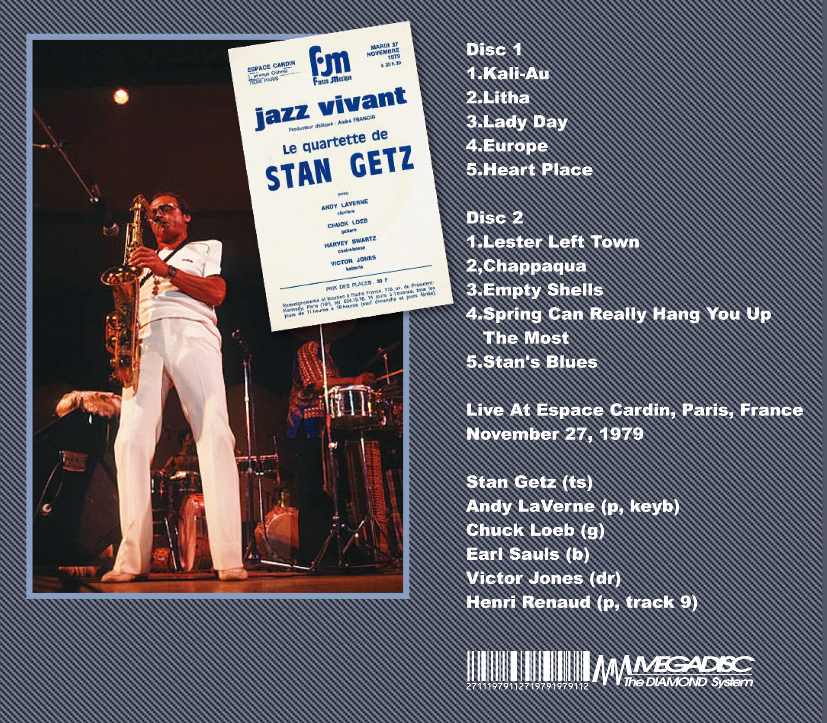 1979年のヨーロッパ・ツアーからパリの有名劇場「エスパス・カルダン」にクインテットで出演したライブの模様を放送音源を録音したテープより劣化が感じられない高クオリティーで収録したゲッツ・ファン垂涎となるタイトルが登場しました。「コロンビア在籍時の1970代はフュージョン色が濃くて聴いていない」というファンの方も多いと思いますが、本ライブにおいてはストレートアヘッドでクールなジャズのライブを存分にご堪能して頂けます。ピアノにはエヴァンスからプライベート・レッスンを受けたことで知られるアンディ・ラヴァーン、ギターには若きチャック・ローブ等で構成されたクインテットとなり、彼らの定評あるサウンドはライブという舞台で更に輝きを放っています。勿論、この日の主人公であるゲッツの邪魔することなく黒子に徹しており、ゲッツのクールで歌心あるテナーは水を得た魚の如く華麗なプレイでライブは展開されています。スタジオ録音では味わうことが出来ない熱いテナーなファンにとって必ずやお宝音源となります。
